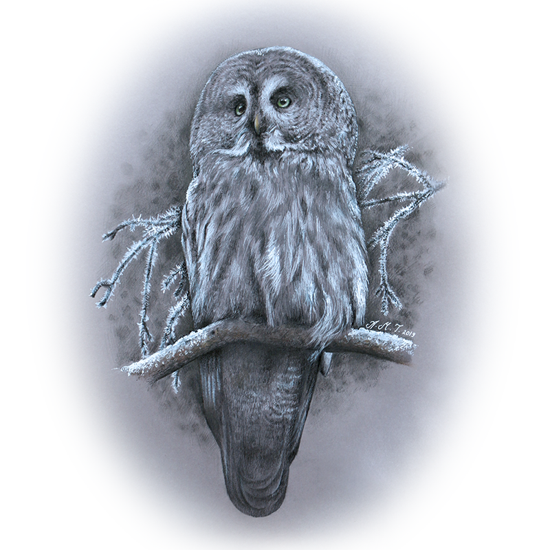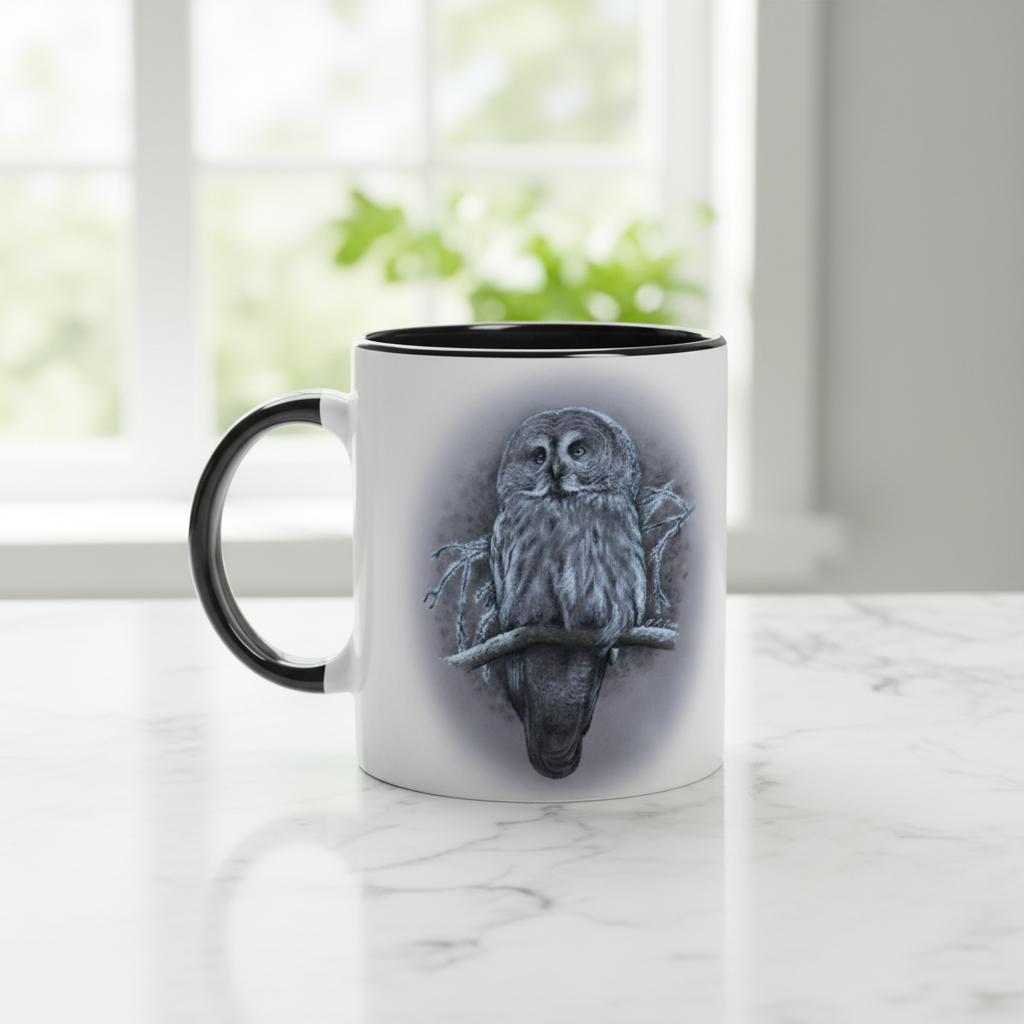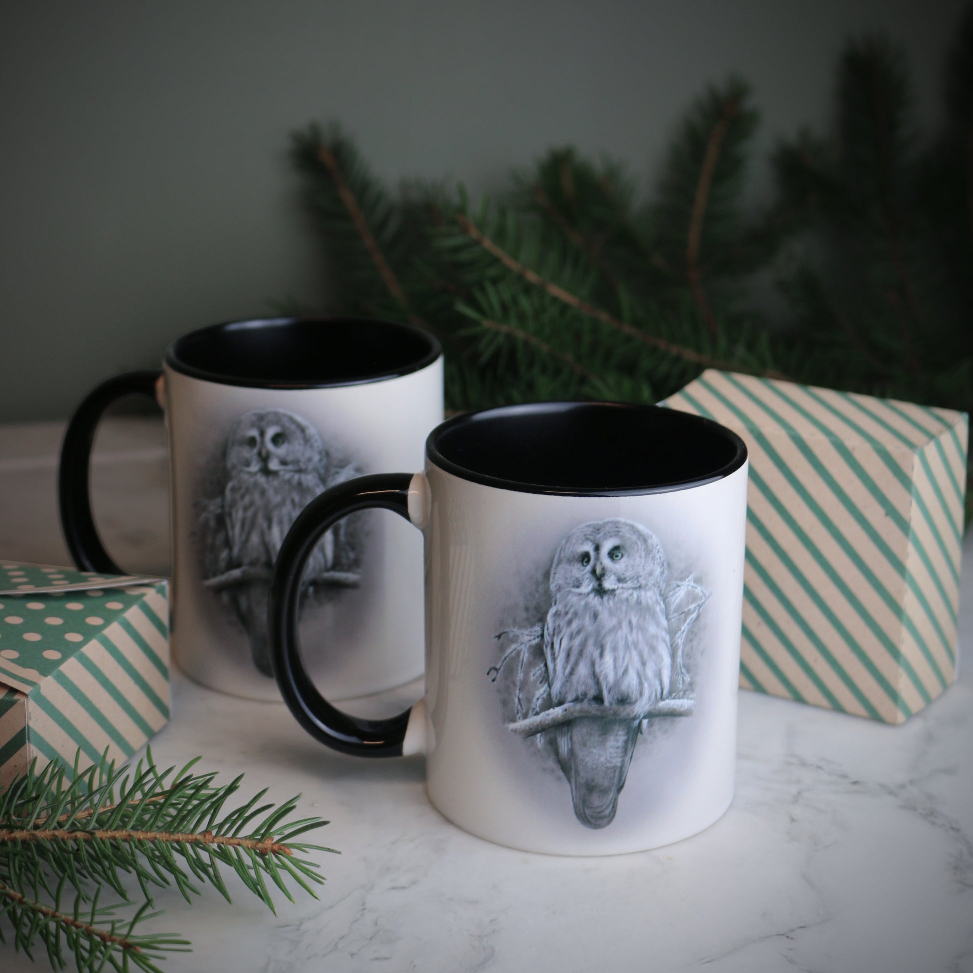 Stilren gråvit keramikmugg med illustration av en lappuggla. Muggen har svart insida och svart öra, vilket ger en fin kontrast till det detaljrika motivet.