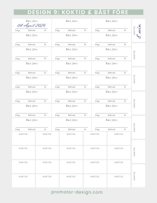✔ Innehåll: Ett ark med totalt 50 etiketter (23 st “Bäst före”, 27 st “Koktid”)